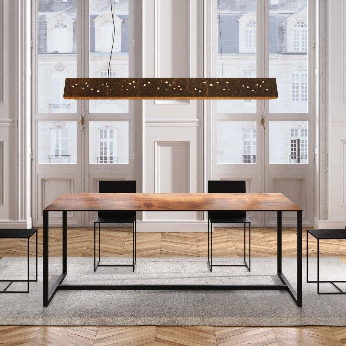 Das Gestell aus Vierkantstahlrohr bildet die Basis des Tisches und ist mit einer Epoxylackierung versehen, was die Oberfläche robust macht. Die Tischplatte aus HPL, einem Hochdruck-verpressten Material, sieht verwittertem Metall verblüffend ähnlich und verleiht dem Tisch einen Hauch von Vintage-Stil. Das Gestell selbst kann recycelt werden und ist ein langlebiger Werkstoff, was die Nachhaltigkeit des Big Brother Esstisches unterstreicht.