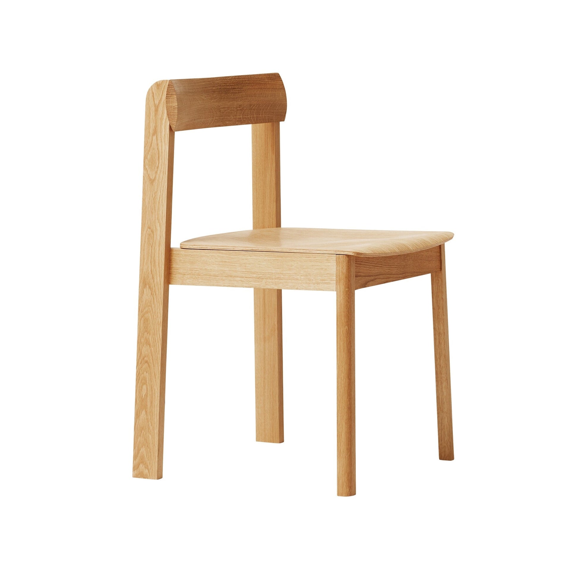 Der Blueprint Stuhl zeichnet sich durch seine Funktionalität und Eleganz aus. Die Sitzfläche ragt über die Vorderkante des Rahmens hinaus und ist leicht gerundet, während die beiden Hinterbeine breiter als die Vorderbeine sind. Die sanft gerundete Rückenlehne ist aus einem Stück Holz hergestellt und umschmeichelt den Körper, während sie perfekt stützt.