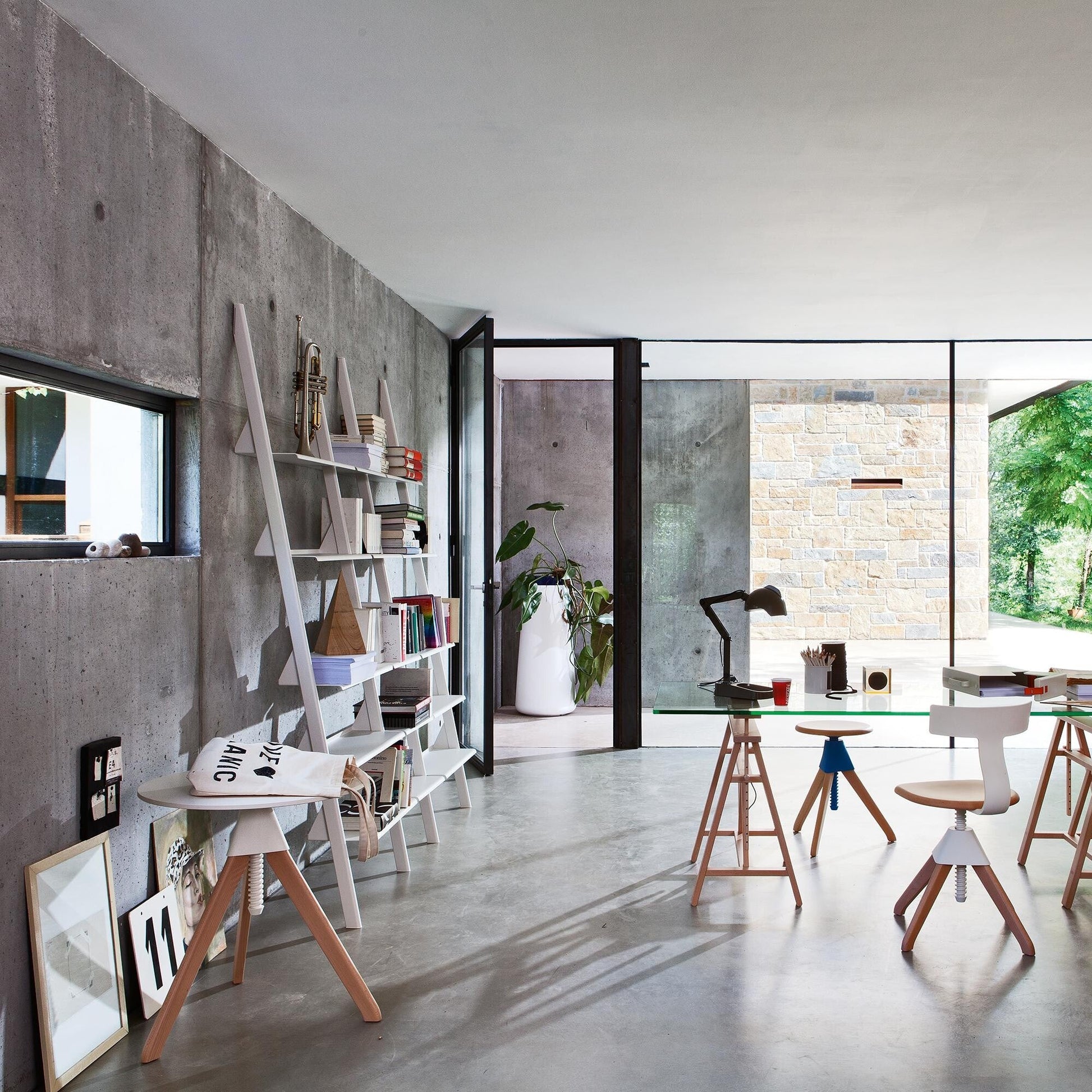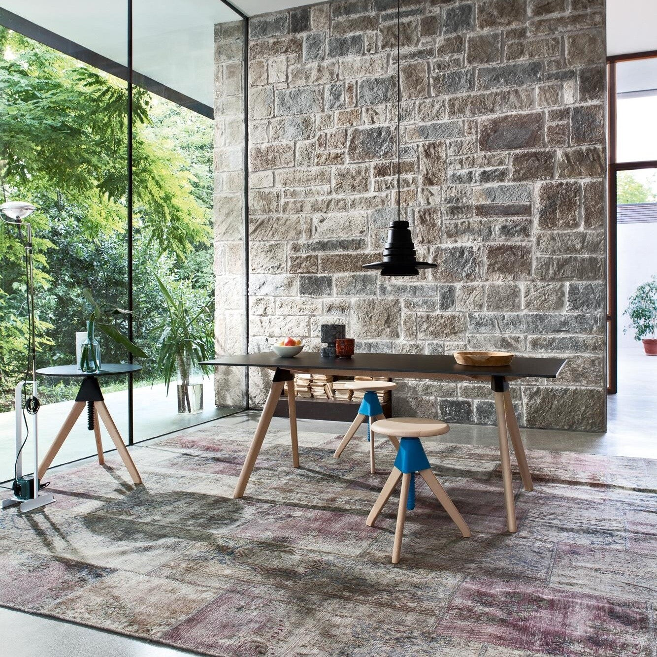 Magis verwendet für die Herstellung des Gestells massive Buche, die durch ihre extreme Härte und Dichte belastbar ist. Die Verbindungselemente zwischen dem Gestell und der Tischplatte sowie die höhenverstellbare Schraube bestehen aus resistentem Polypropylen. Die runde Tischplatte wurde aus übereinandergeschichteten Papierlagen gefertigt, die anschließend verharzt und unter Hochdruck zusammengepresst wurden. Dieses Laminat ist zu 100 Prozent witterungsbeständig, brandsicher und leicht zu reinigen.