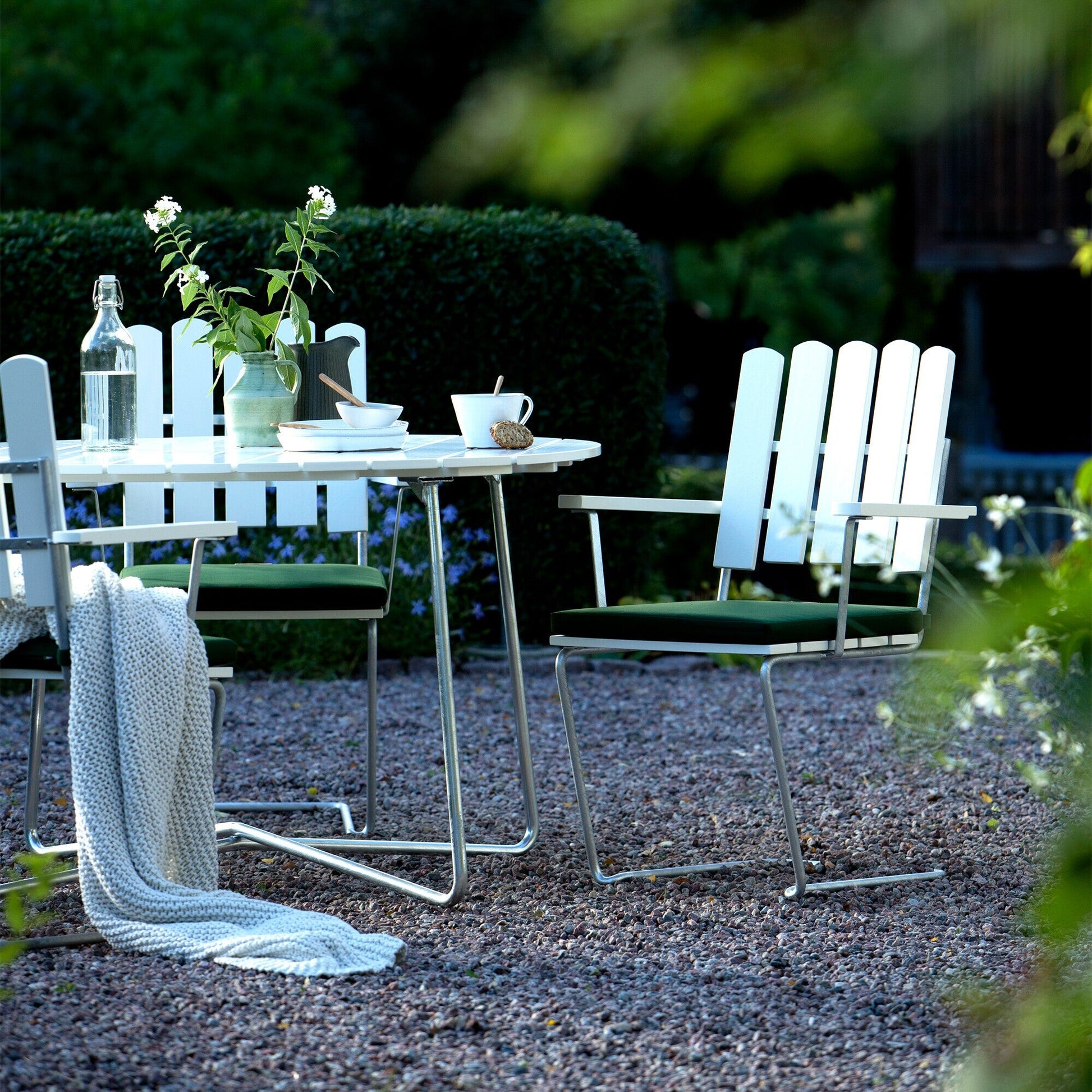 Als bekanntestes Möbelstück des Herstellers Grythyttan Stålmöbler bildet der A2 Gartenarmlehnstuhl Eiche einen unvergleichlichen Blickfang auf jeder Terrasse und jedem Balkon. Seine Beliebtheit verdankt er nicht nur seiner zeitlosen Ästhetik, sondern auch der beruhigenden Schwingbewegung, die durch das solide Untergestell gewährleistet wird. Dieses Untergestell besteht aus präzisem Handwerk aus massivem, feuerverzinktem Federstahl.