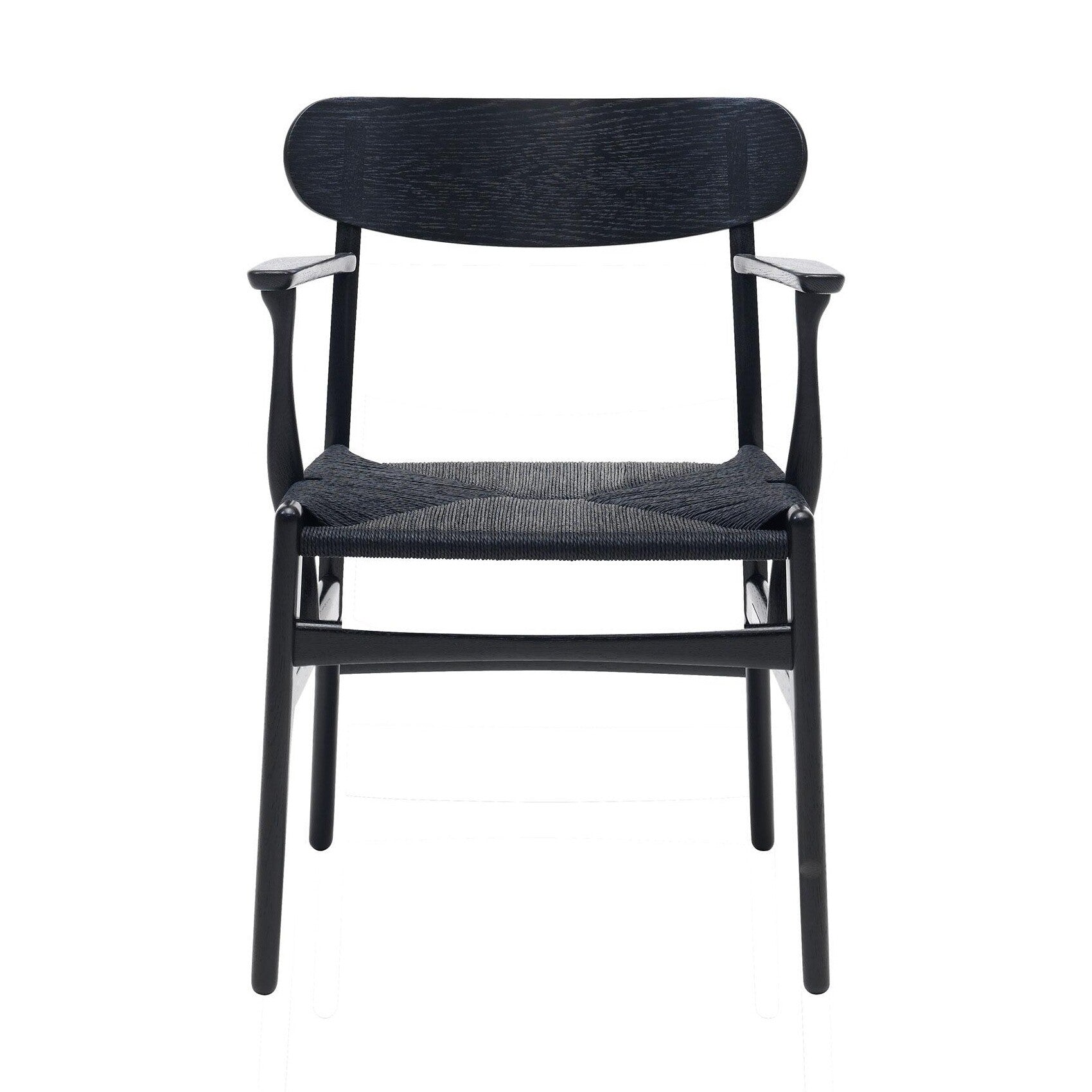 Der CH26 Armlehnstuhl lädt durch seine raffinierte Gestaltung zu längerem Verweilen am Tisch ein. Die organischen Formen gepaart mit der raffinierten Rückenlehne und dem handgewebten Sitz sind ein wahres Highlight in jeder Wohnung und rücken die Stimmung Richtung Lounge. Die Sitzfläche besteht aus schwarzem oder naturfarbenem Papiergarn, während das Gestell aus massiver Eiche oder Walnuss gefertigt wird.