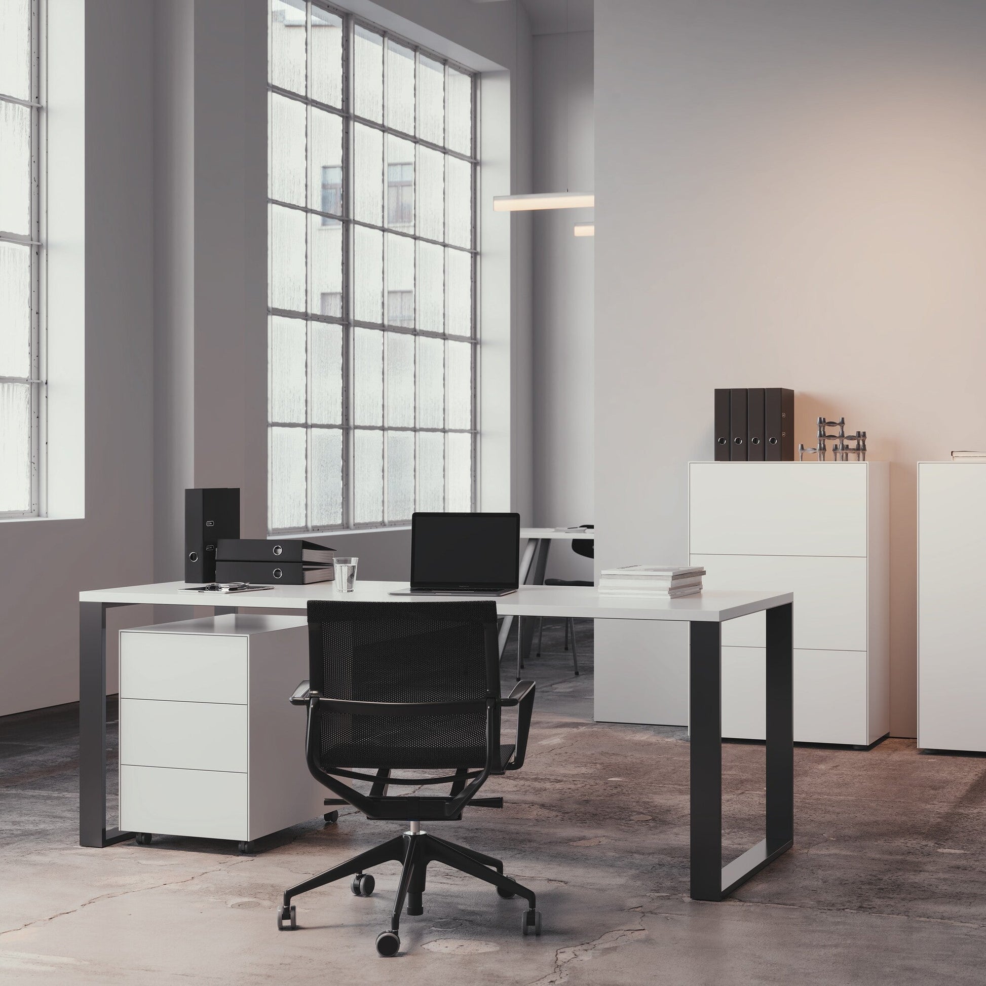 Ausführungen: Nex Pur Office Schreibtisch 150x75x75cm / weiß/Tischplatte strukturlackiert 2,5cm/Gestell Stahl kohle pulverbeschichtet