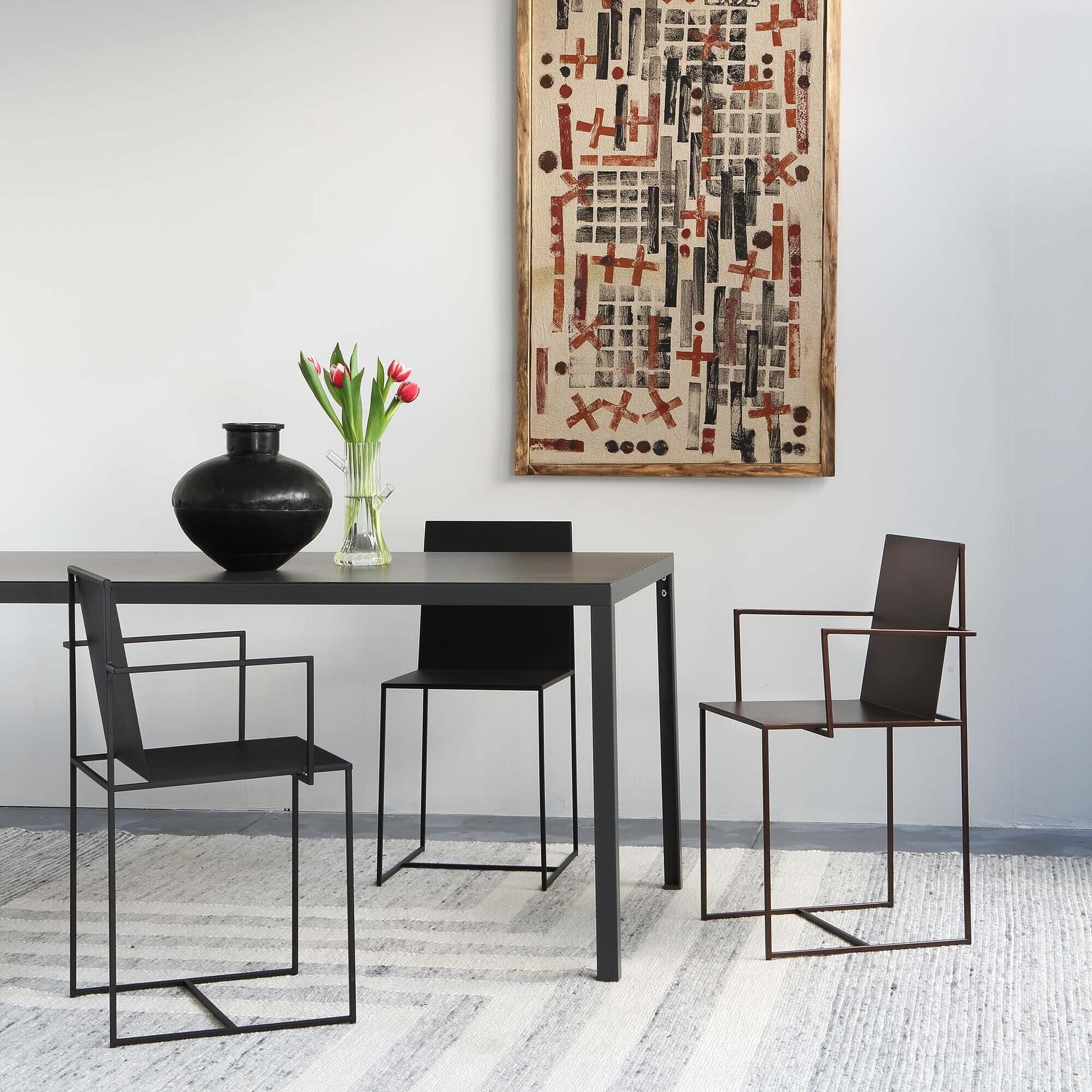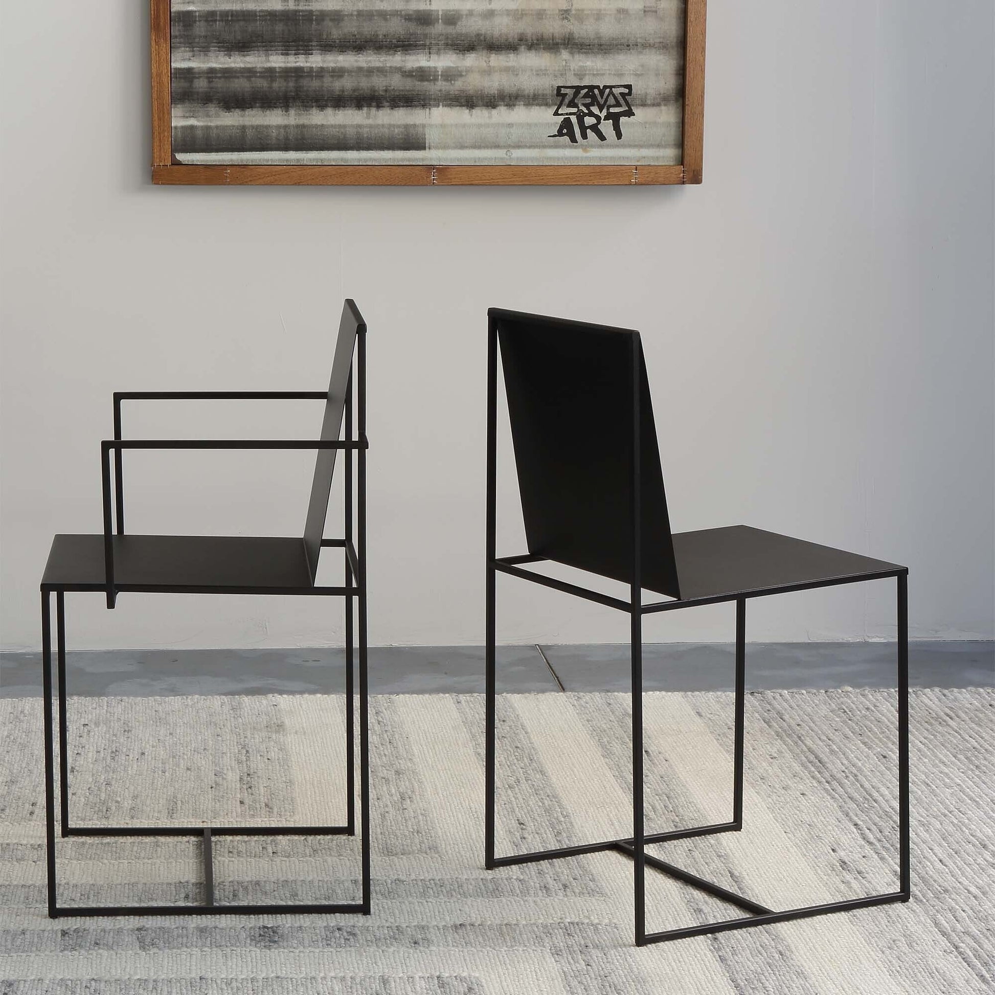 Die Konstruktion dieses Sitzmöbels besteht aus einem Gitterrahmen aus Vierkantstahl, der mit seinen rechten Winkeln und geraden Linien eine attraktive Silhouette zeichnet. Die Stuhlbeine sind durch Kufen und eine Querverbindung verstrebt, was dem Gestell trotz seiner filigranen Dimensionen eine hohe Stabilität verleiht. Die Armlehnen bestehen aus je einem geknickten Stab, während die Sitzfläche und die Lehne aus zwei rechteckigen Stahlblechplatten gebildet werden. Diese Gestaltung verleiht dem Sitzmöbel einen skulpturalen Charakter, der durch die matten Epoxylackierung noch unterstrichen wird.