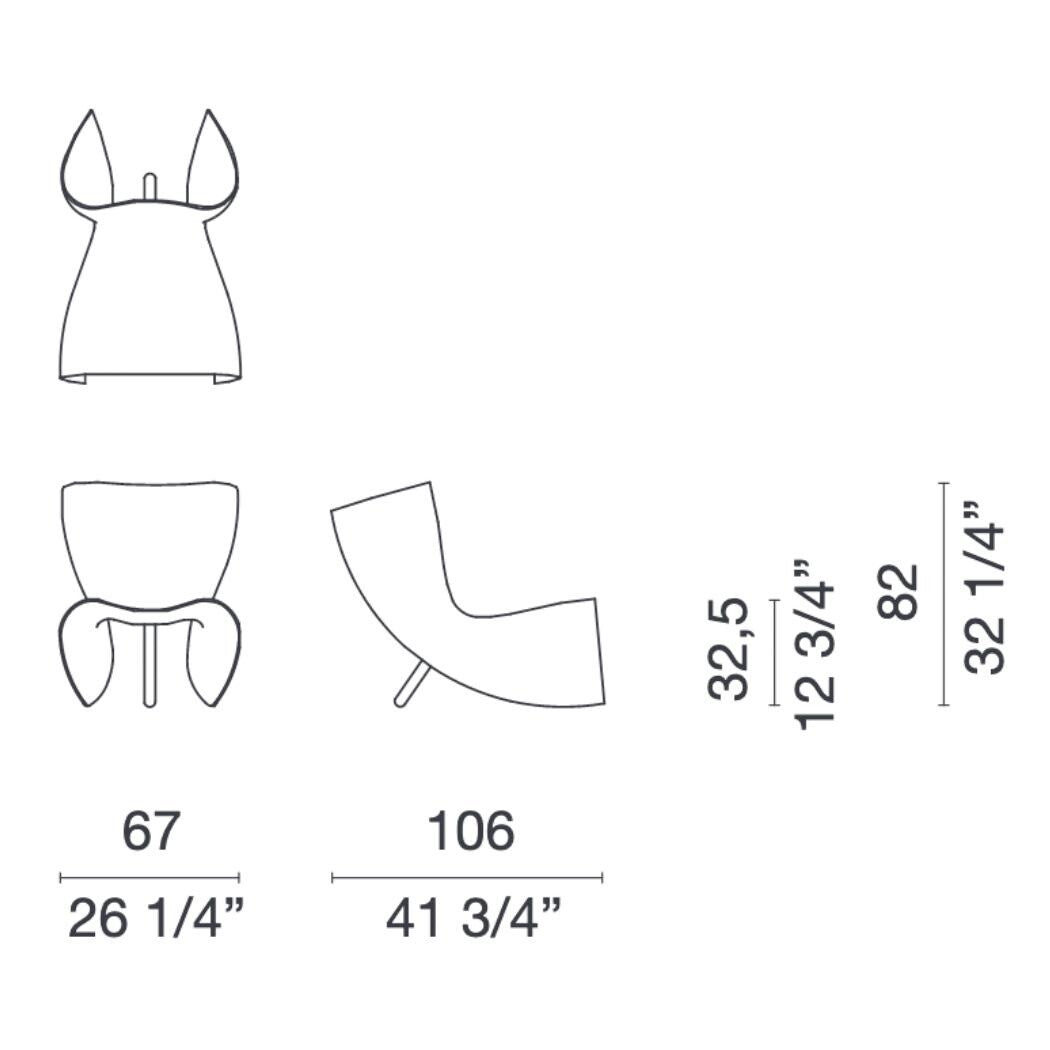 Abmessungen: Breite: 67cmHöhe: 82cmTiefe: 106cmSitzhöhe: 32.5cmHöhe Rückenlehne: 82cm