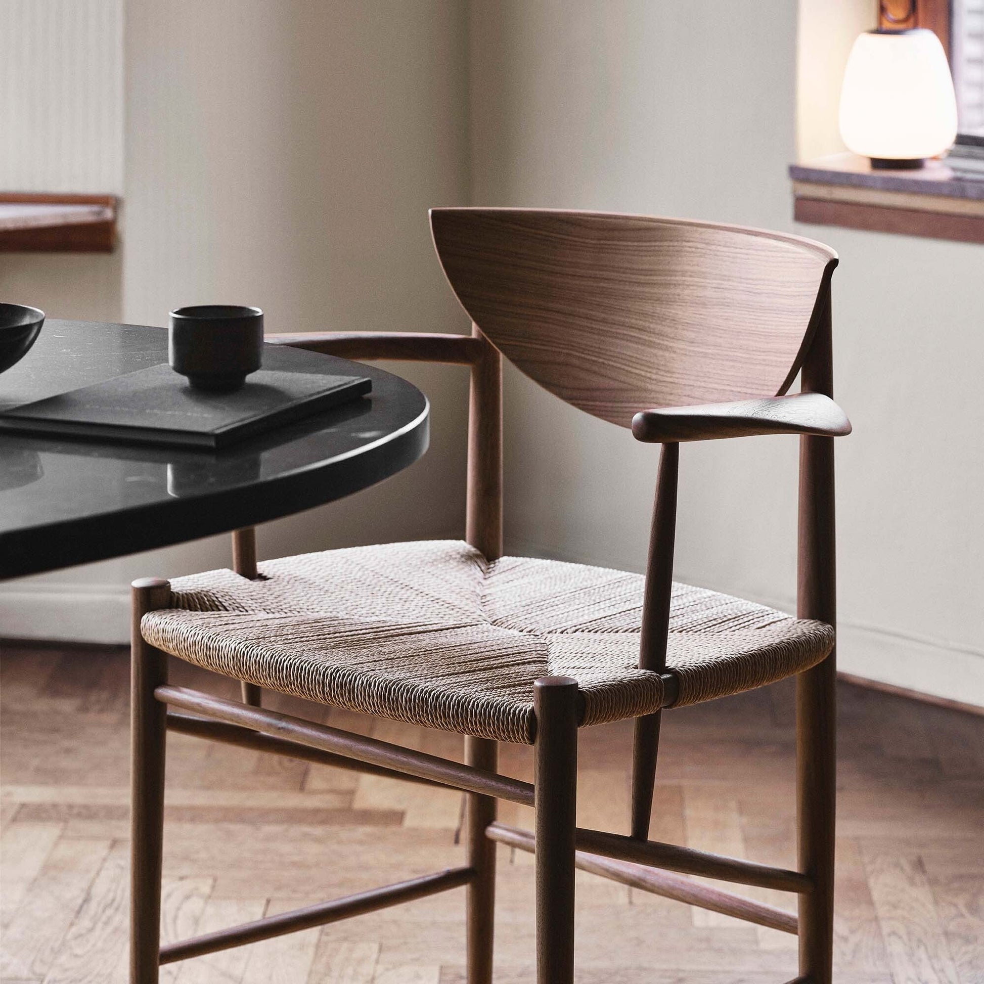 Der Stuhl ist besonders durch seine seitlich schräg verlaufenden Streben zwischen den Stuhlbeinen und die halbrunde Rückenlehne gekennzeichnet. Die hohen, breiten Armlehnen ermöglichen eine entspannte Haltung, beispielsweise bei den Mahlzeiten. Die Sitzfläche aus natürlicher Papierkordel sorgt für ein angenehmes Sitzgefühl. Der Drawn HM4 Armlehnstuhl ist vor allem für eine gemütliche Essecke mit rustikaler Ausstrahlung prädestiniert, passt aber auch zu einer minimalistischen Einrichtung.