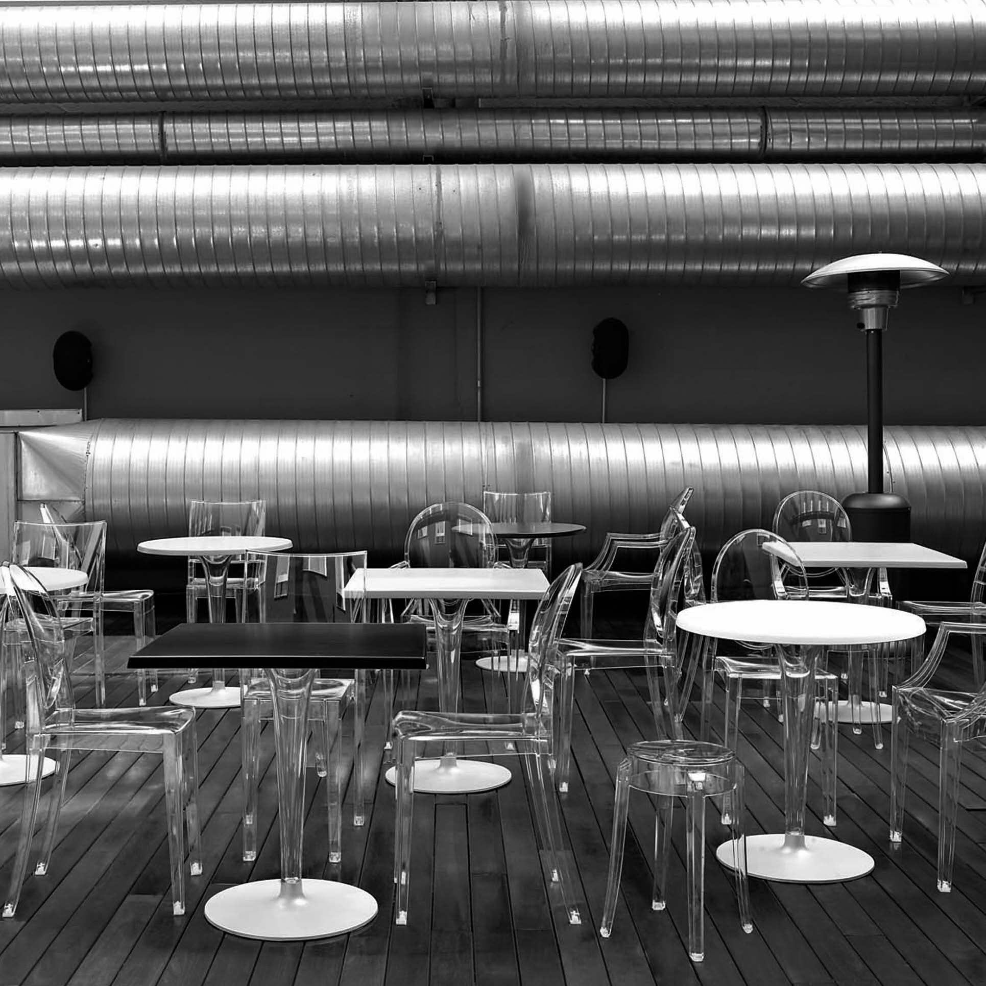 Die robuste Konstruktion besteht aus einer runden Melamintischplatte aus Werzalit in zwei Größen und Farben, die sich harmonisch mit der gleichfarbigen Aluminiumbasis verbindet. Das transparente Tischbein mit seinem rund oder quadratischen Querschnitt präsentiert eine facettierte Oberfläche und einen Metallkern, der die Stabilität und das Design in perfekter Harmonie vereint.