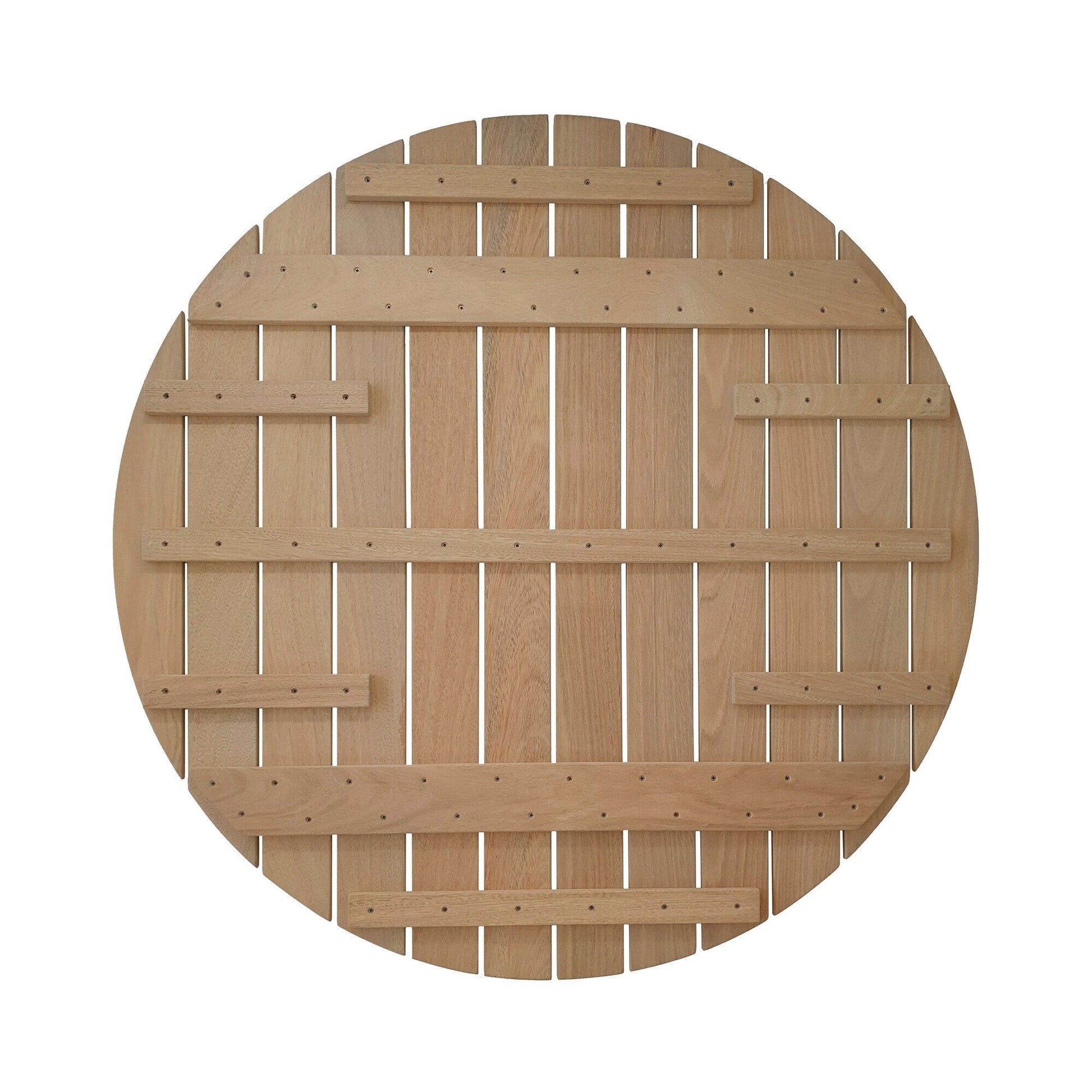 Der Gartenesstisch zeichnet sich durch eine sorgfältige Verarbeitung aus. Auf einem abnehmbaren Untergestell aus feuerverzinktem Stahl liegt die runde Tischplatte, die mit Edelstahlschrauben fixiert ist. Sie besteht aus zwölf Holzplanken aus unbehandeltem Teak, das mit der Zeit eine graue Patina und damit einen einzigartigen Charakter entwickelt. Das Holz stammt aus FSC-zertifizierter Herstellung und ist zu 100% recycelbar.