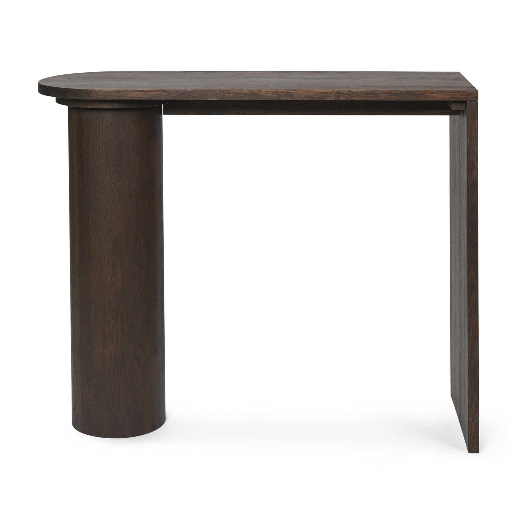 Ein markantes Merkmal dieses extravaganten Holzmöbels ist der tonnenförmige Standfuß, der einer wuchtigen Säule gleicht, während das gegenüberstehende Stützelement als Platte ausgebildet ist. Dadurch zeigt der Pylo Konsolentisch in der Ansicht eine auffällige Asymmetrie, die in den ungleichen Kantenformen der Tischplatte fortgesetzt wird. Die längliche Tischfläche über der Pylon-Säule bildet einen halbrunden Abschluss, während die andere Schmalseite gerade geschnitten ist.