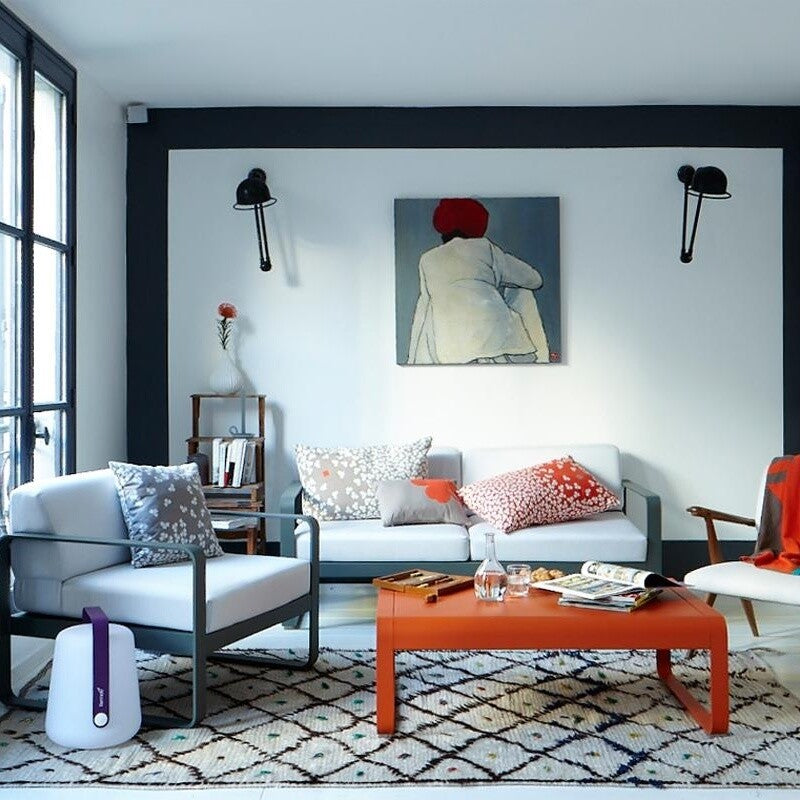 Das Aluminiumgestell des Sofas wird mit einer edlen weißen Polsterung kombiniert. Das exklusive Fermob-Gewebe ist maschinenwaschbar, atmungsaktiv und ausgestattet mit einer hohen Qualität, die es auch für den Outdoor-Bereich geeignet macht. Durch die Wahl der Gestellfarbe können interessante Akzente gesetzt werden.