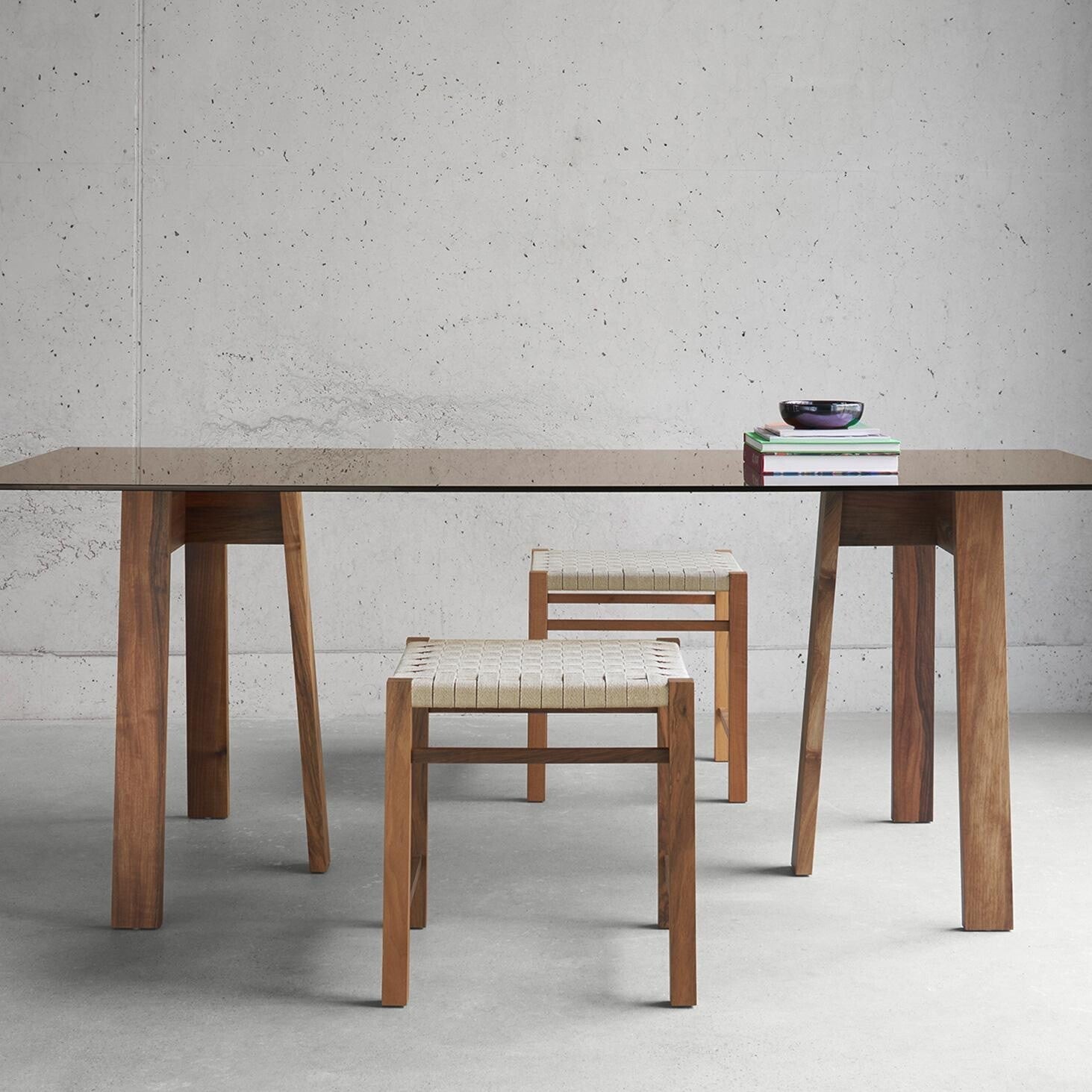 Ausführungen: Aswan Hocker / nussbaum/Textilgeflecht/LxBxH 45x45x47cm/Gestell nussbaum