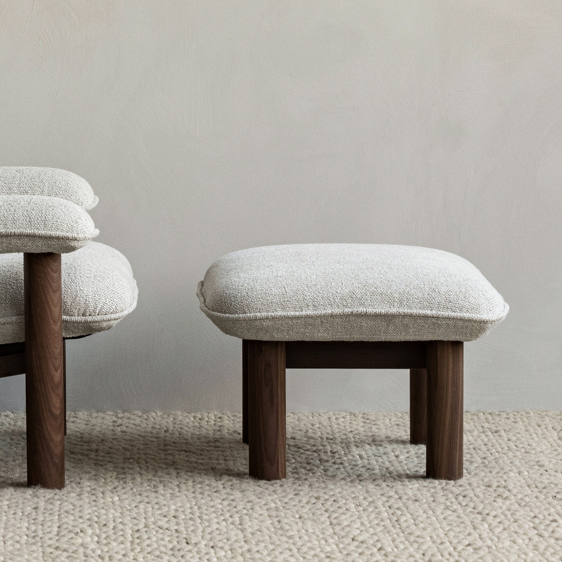 Die großzügige Polsterung aus hochwertigem Schaumstoff sorgt für ein weiches, einladendes Sitzgefühl, während der robuste Rahmen aus massivem Eichenholz Stabilität und eine harmonische Balance aus kraftvollen Proportionen und sanften Formen verleiht. Die grob texturierte Stoffbespannung bietet nicht nur eine angenehme Haptik, sondern sorgt auch für eine stilvolle Optik, die sich mühelos in unterschiedliche Wohnräume einfügt. Als flexible Sitzgelegenheit oder als Fußablage für den Brasilia Lounge Chair, überzeugt der Brasilia Ottoman durch seine Vielseitigkeit.