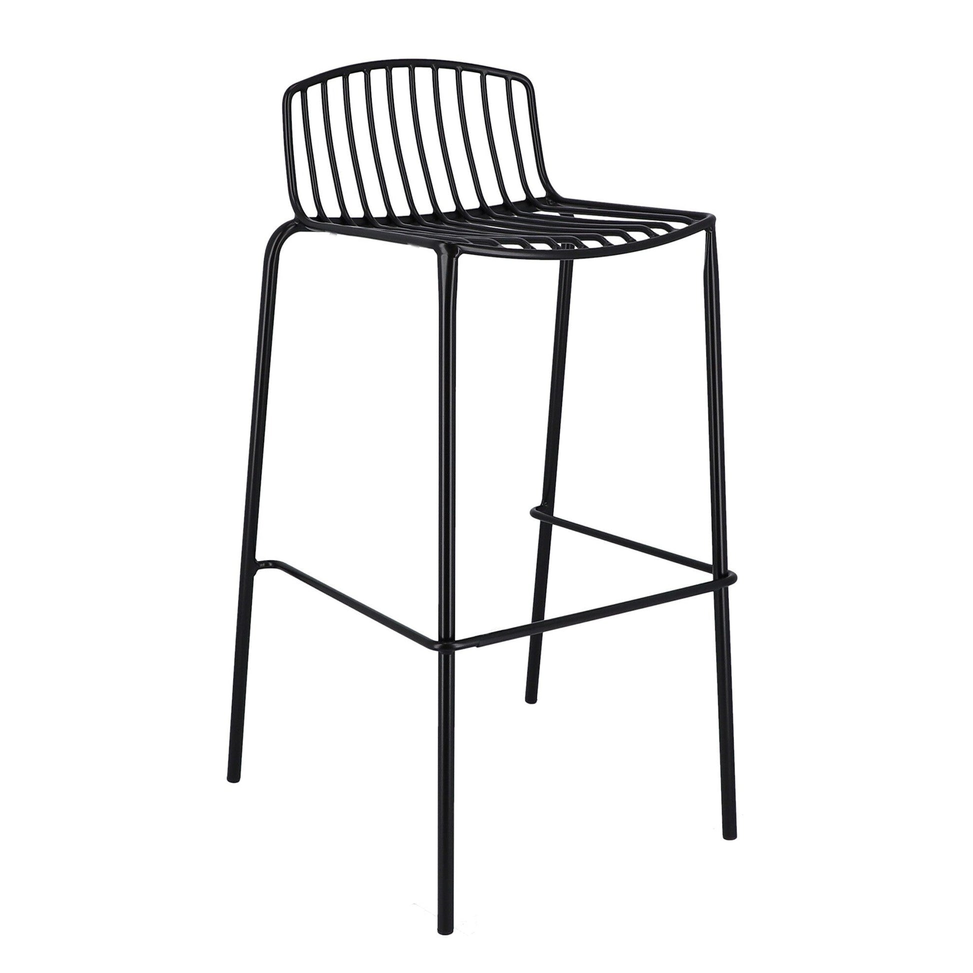 Die kurze, abgerundete Rückenlehne des Stuhls bietet Halt und ist ebenso überzeugend wie die leicht konkave Sitzfläche mit schmalen, ineinander fortlaufenden Verstrebungen. Das schlanke Gestell mit vier zarten Beinen sorgt mit seiner Fußstütze vorne und an den Seiten für einen stabilen Sitzkomfort. Der wetterbeständige Gartenbarstuhl ist aus pulverbeschichtetem Stahl gefertigt und bietet eine Vielzahl von neutralen bis leuchtenden Farben, die sich ideal miteinander kombinieren lassen.