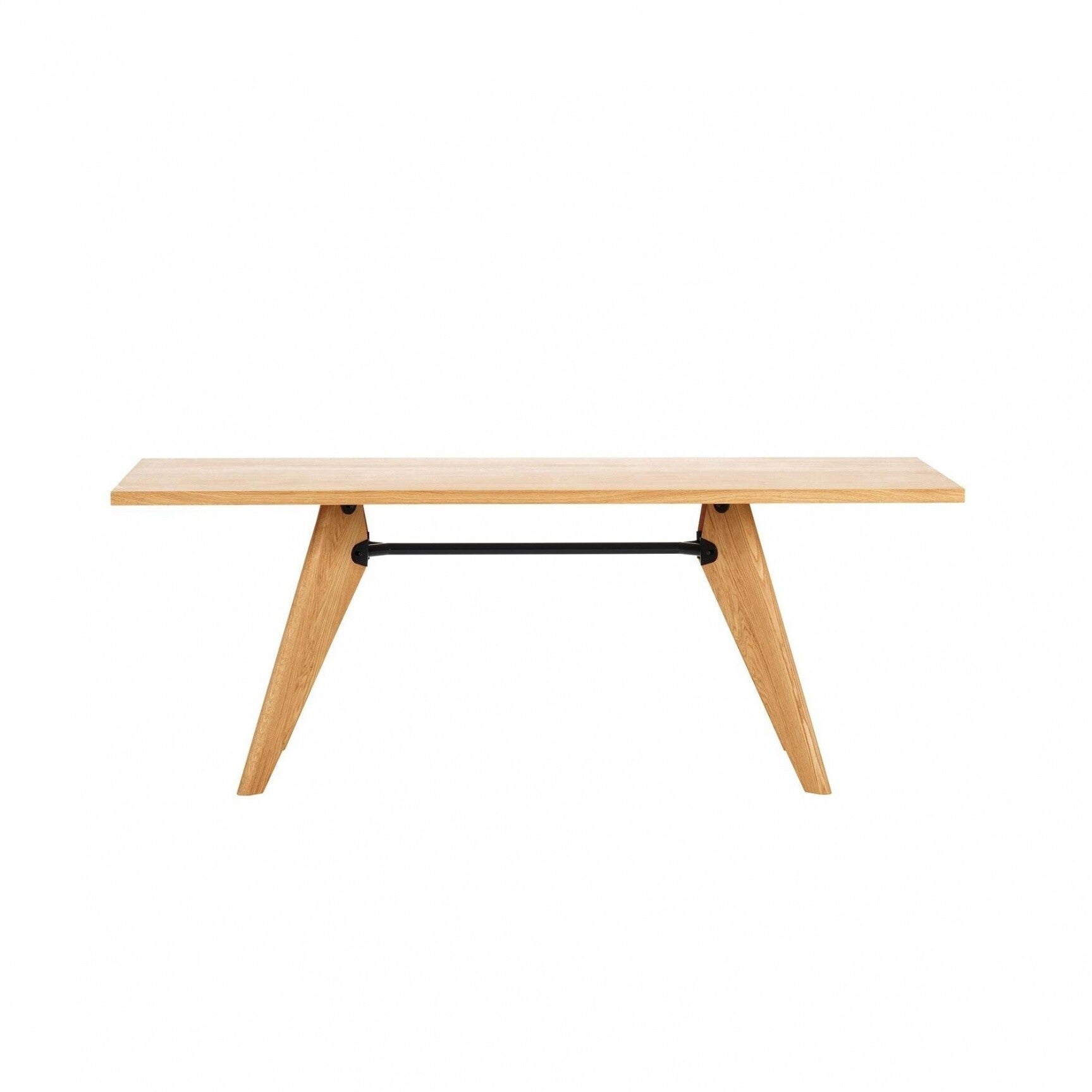 Die Tischplatte besteht aus 34 mm starkem, massivem Holz, das mit einer feinen Ölung versehen ist. Die Tischbeine sind ebenfalls aus Holz gefertigt und dienen als diagonale Verstärkung. Die Verbindungselemente aus Stahlrohr sorgen für die notwendige Stabilität, während die elegante Form durch die kraftvolle Konstruktion unterstrichen wird. Der Tisch besteht aus massiver Eiche und bietet eine Höhe von 74 cm, eine Tiefe von 90 cm und eine Länge von 180 cm.