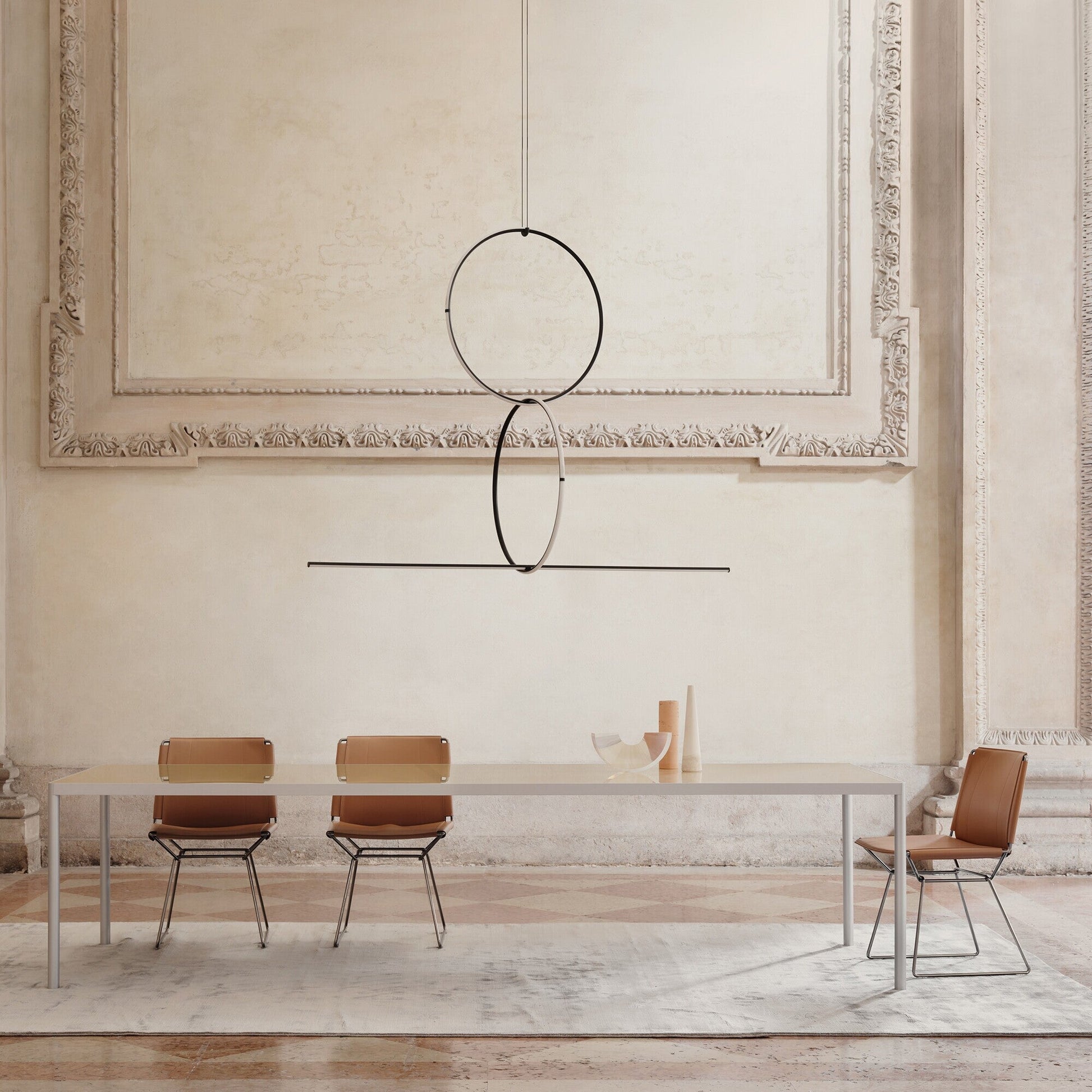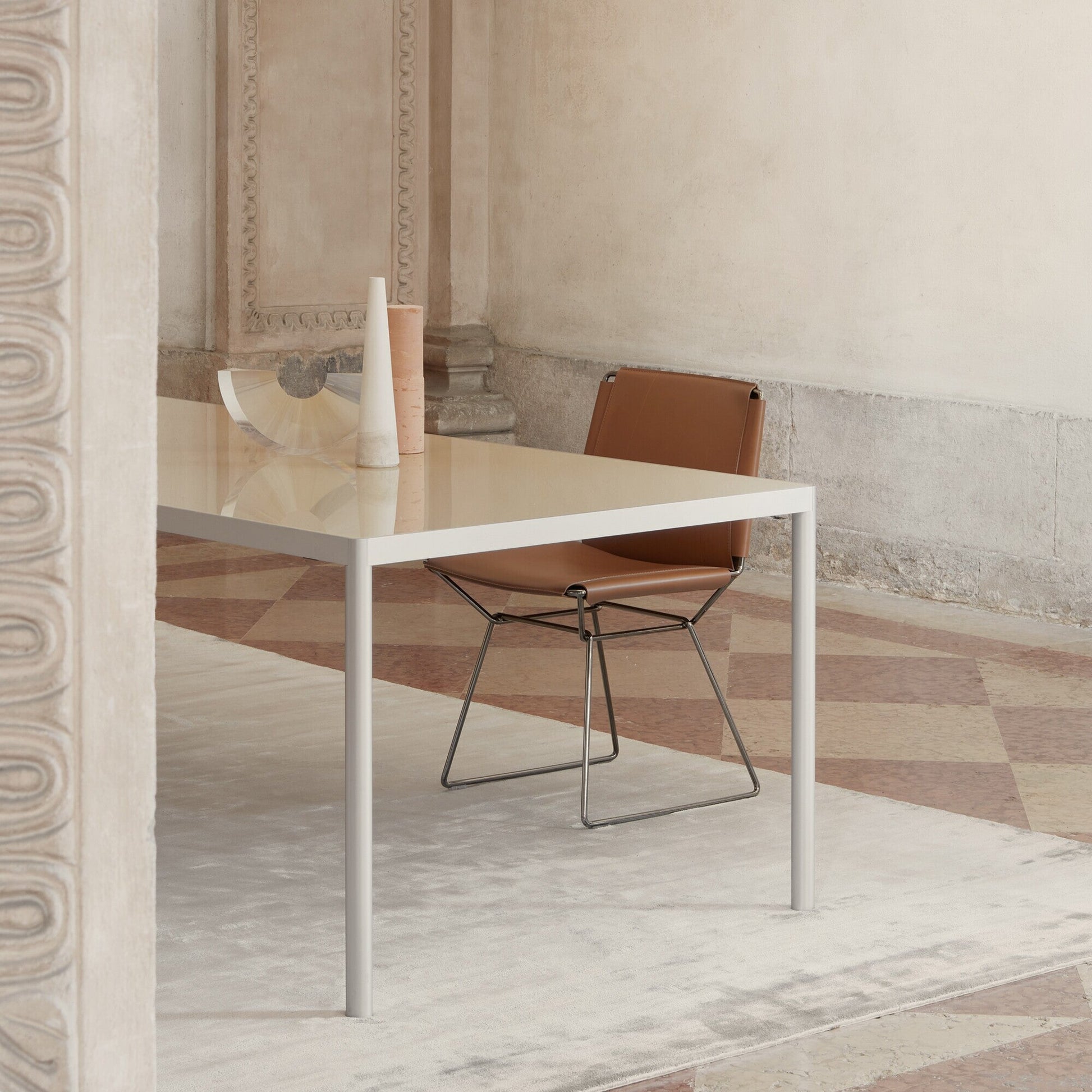 Das Augenmerk des Stuhls liegt auf dem raffinierten Stahlgestell, das durch eine umgedrehte U-Form eine einzigartige Architektur schafft. Die Sitzfläche und die Rückenlehne sind zweilagig mit dickem Sattelleder bespannt, das durch Nähte mit festem Garn und gepresste Rillen eine haptische Struktur aufweist. Das Leder wird in Handarbeit in Italien hergestellt und unter Verwendung eines ökologischen Gerbprozesses, der eine minimale Schadstoffbelastung gewährleistet.