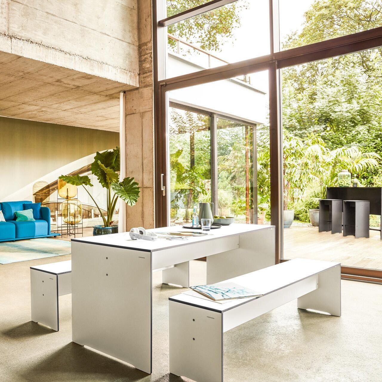 Mit seiner geradlinigen, hellen und robusten Form wirkt der Riva Tisch als Lichtblick in jedem Raum, unabhängig von der Wetterlage. Der Tisch besteht aus kratzfestem HPL-Kunststoff, der seine Eleganz und Funktionalität überzeugend verbindet.