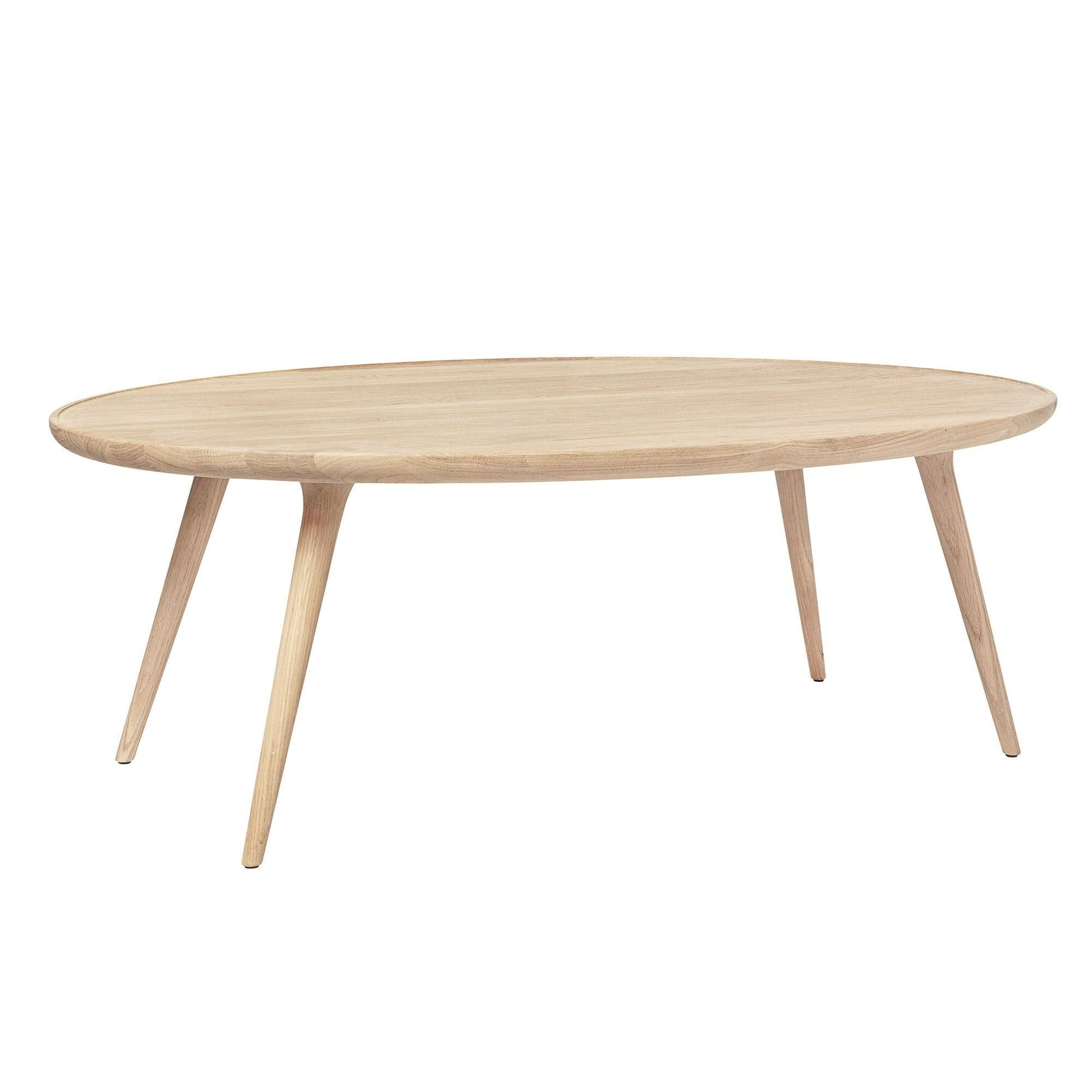 Das Oval der Tischplatte bietet genügend Platz für die Abstellung von Getränken, Snacks oder die Lektüre. Die leicht erhöhte Kante verhindert, dass Gegenstände über den Tischrand rutschen, während die abgerundete Unterseite einen haptischen Reiz bietet. Die vier ausgestellten Beine sorgen für einen stabilen Stand, während die runde Form nach unten hin verjüngt und dem Tisch einen leichten Touch verleiht.