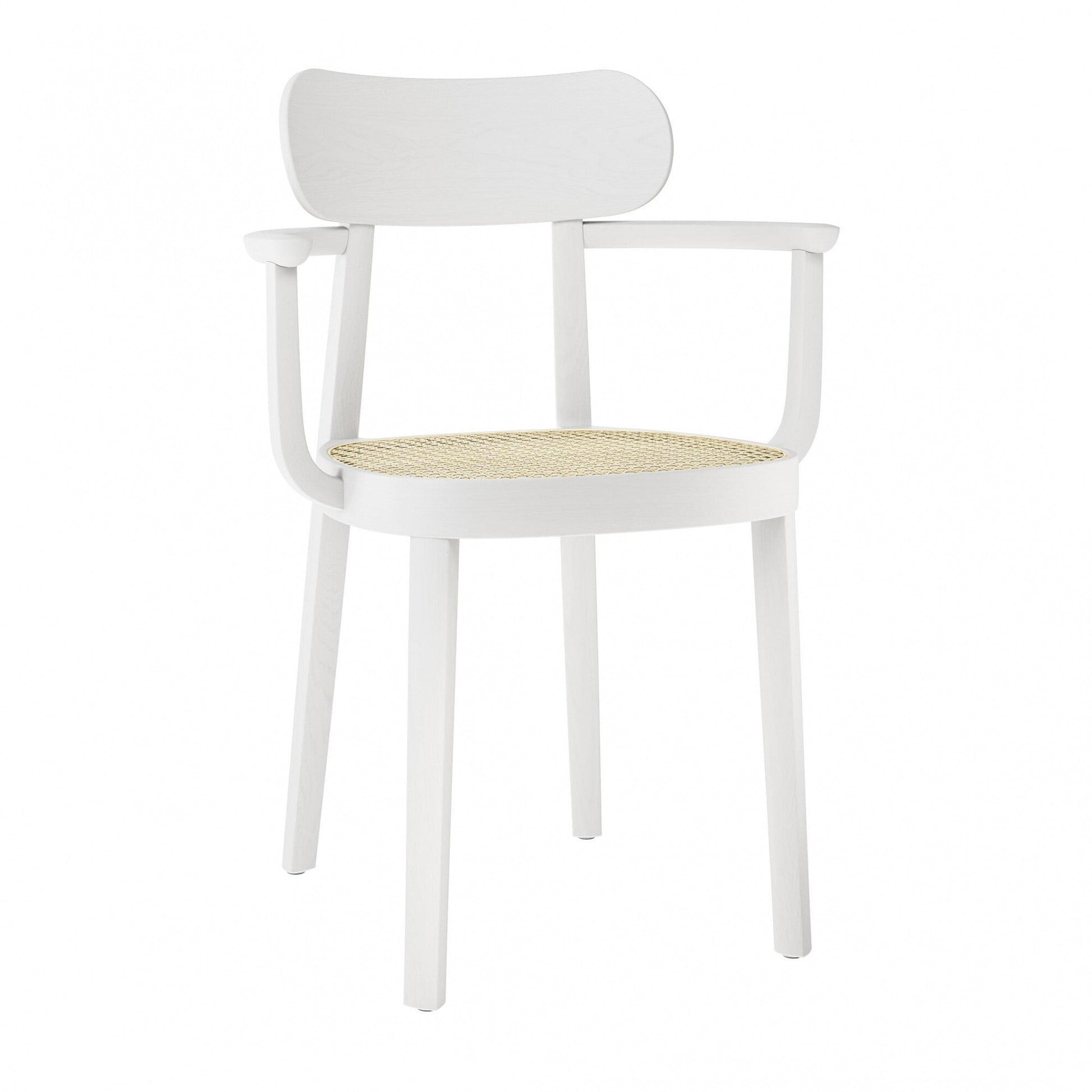 Ausführungen: 118 F Armlehnstuhl mit Rohrgeflecht / weiß lasiert TP 200/Rohrgeflecht mit Netzverstärkung/BxHxT 56x80x50cm/Buche gebeizt