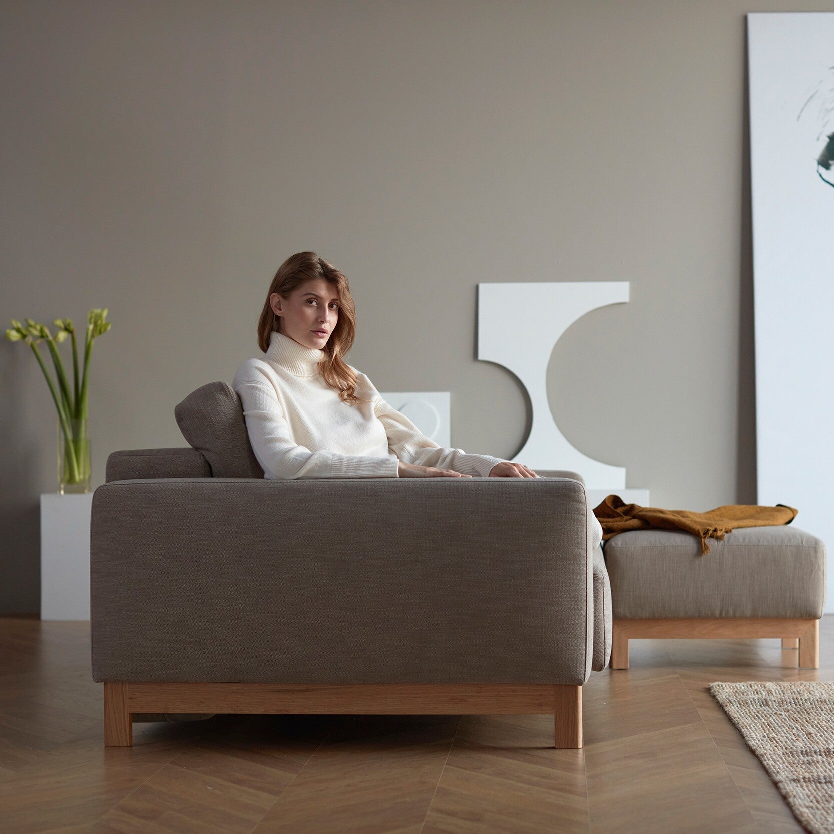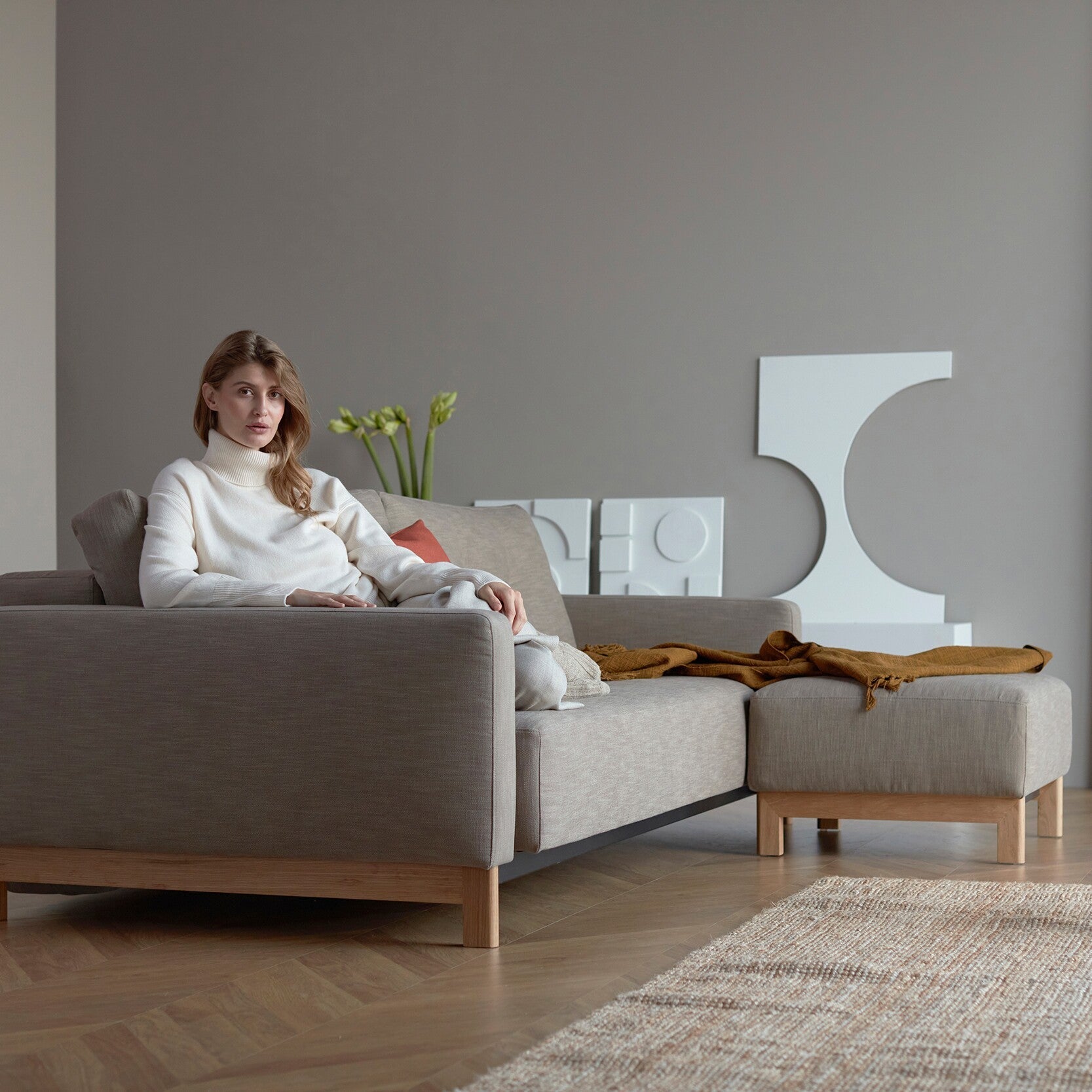 Mit seinen kompakten Abmessungen von 66x66cm x 40cm ist er ein platzsparendes Möbelstück, das vor ein Sofa geschoben zum entspannten Hochlegen der Beine einlädt und gleichzeitig einen zusätzlichen Sitzplatz für Gäste bietet. Dadurch passt der Ottomane perfekt in die Sofalandschaft im Wohnzimmer und ist zudem ein elegantes Sitzmöbel an der Fensterbank, in einer Leseecke oder im Vorzimmer. Als Begleiter zum Pyxis-Schlafsofa kann er im Gästezimmer zum Ablegen der Garderobe dienen.