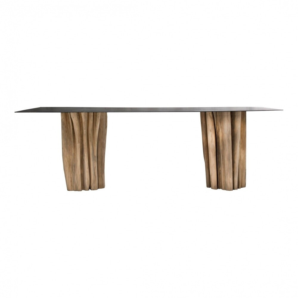 Die Tischbeine, die sich an den Baumstämmen erinnern, sind jedoch künstlerisch bearbeitet und veredelt. Die Skulpturen, auf denen die stählerne Tischplatte ruht, sind abgerindet und von Hand geschnitzt aus Wrightia, einer Holzart, die in der ayurvedischen Tradition geschätzt wird. Diese sorgfältige Handwerkskunst ist ein Zeichen für die Qualität und Exklusivität dieses Möbelstücks.