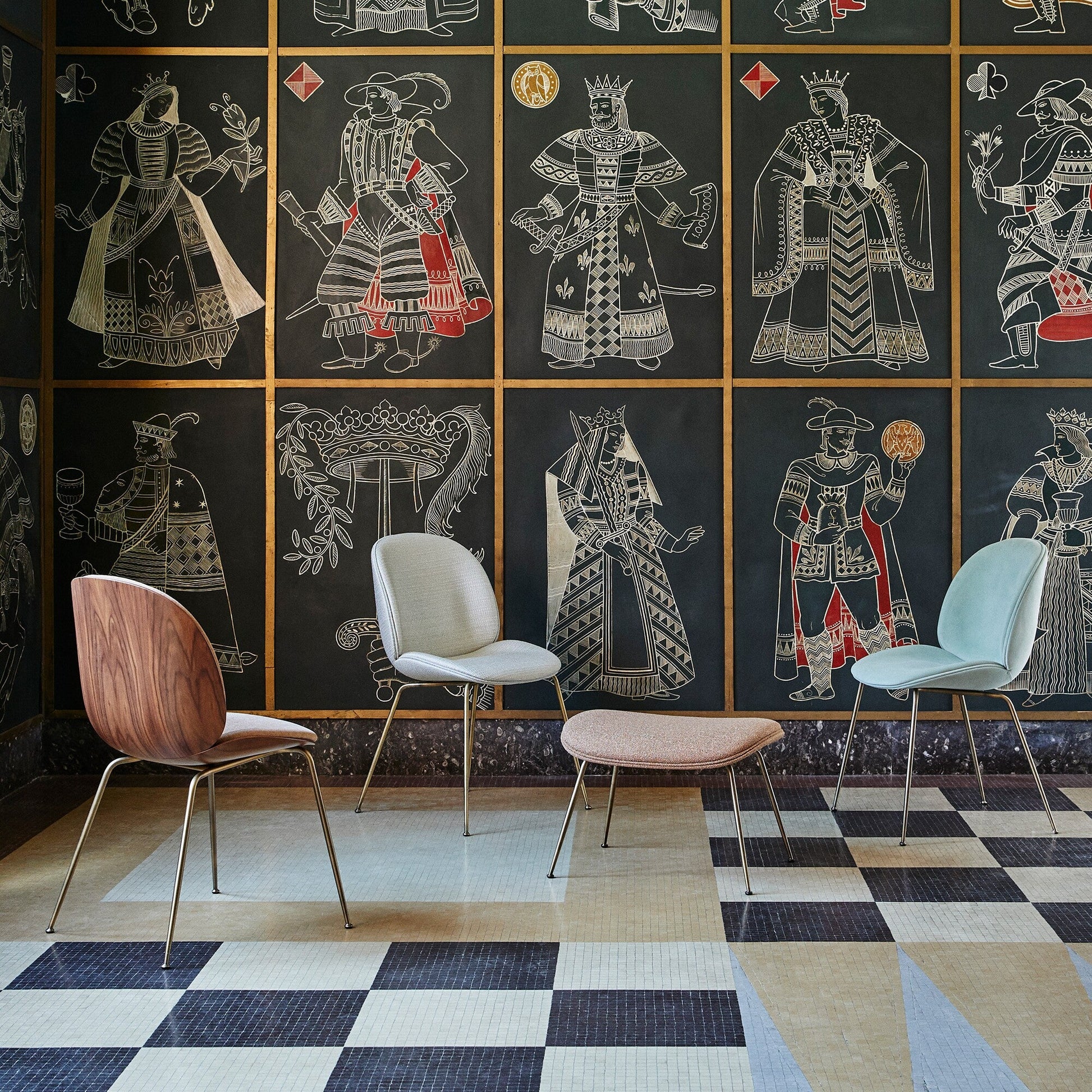 Der Beetle 3D Veneer Stuhl Stoff gepolstert ist ein Meisterwerk des Designers GamFratesi für die Marke Gubi. Er ist Teil einer Serie, die sich durch eine einzigartige Silhouette auszeichnet, die sich wie ein Panzer um den Körper schmiegt. Der Name "Beetle" ist ein Hinweis auf die Ähnlichkeit der Rückenlehne und des Sitzes mit dem Panzer eines Käfers.